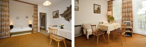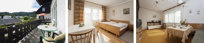 Im Haupthaus im 1. Stock befindet sich Appartement H5: Dieses ist 32m2 groß, bietet einen 9 m2 Balkon, einen Vorraum, einen Wohnschlafraum (Doppelbett hinter Vorhang in Nische) mit Eßplatz, eine Kochnische und ein Bad/WC für bis zu 3 Personen.